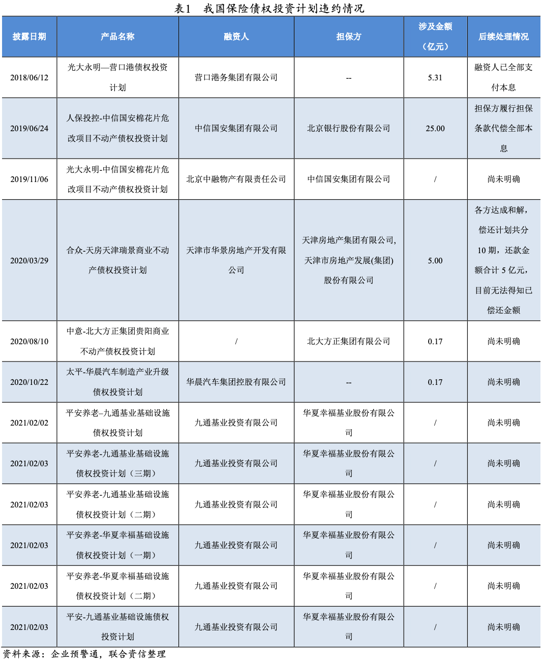 債權投資計劃方面,截至2021年8月底,中國保險資產管理業協會協會(以下簡稱“保資管協會”)共登記(注冊)債權投資計劃2004只,登記(注冊)規模41287.71億元。但保資管協會并未披露逾期及違約的債權投資計劃數量及金額,原因系債權投資計劃主要是保險資金投資,債項級別主要在AAA級,且該產品是私募發行,違約后保險資管公司傾向于私下解決,所以市場上披露的債權投資計劃違約數量不多,2018年至2021年10月25日,僅違約12只保險債權投資計劃,其中與華夏幸福基業股份有限公司(以下簡稱“華夏幸福”)有關的違約債權投資計劃共計6只。