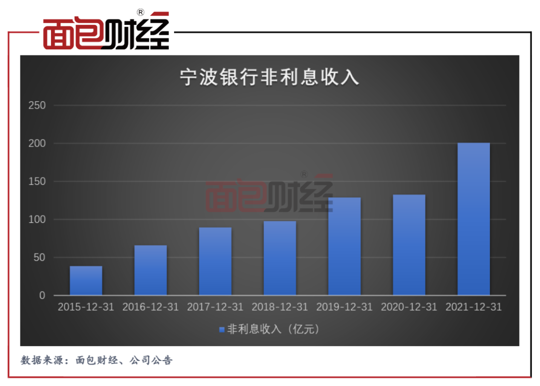 年報(bào)顯示,得益于盈利結(jié)構(gòu)的持續(xù)優(yōu)化,該行大零售及輕資本業(yè)務(wù)的盈利占比不斷提升,非息收入持續(xù)提升。2021年,寧波銀行實(shí)現(xiàn)非利息收入200.77億元,同比增長(zhǎng)51.5%,在營(yíng)業(yè)收入中占比為38.04%。其中手續(xù)費(fèi)及傭金凈收入82.62億元,同比增長(zhǎng)30.27%。