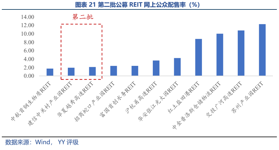 第二批公募REIT只有兩只:華夏越秀高速REIT和建信中關村REIT,整體看底層資產優秀,建信中關村REIT的現金流分派率處于園區類前列。第二批公募REITs認購“火爆”,網下和網上的配售率均不足3%;上市前幾日溢價率最高達38%、40%,之后企穩,但收益率仍高于REITs同類的其他產品。整體看,受益于底層資產的優質、現金分派率較高(建信中關村REIT)以及投資者情緒的高漲,第二批REITs表現亮眼。