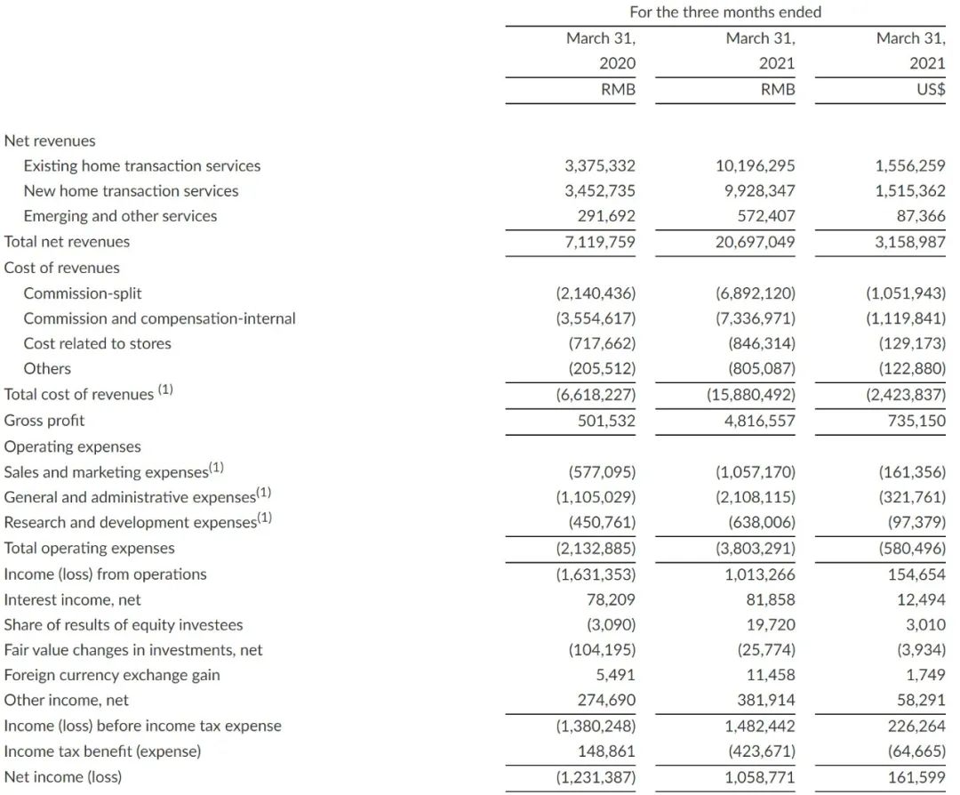 5月19日,貝殼找房發(fā)布了2021年第一季度未經(jīng)審計的財務(wù)業(yè)績: