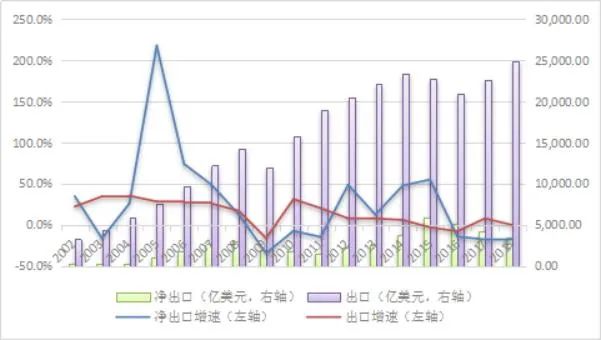 圖1.2002-2018年凈出口額、出口額及其增速