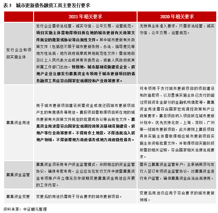 8月10日,交易商協(xié)會(huì)發(fā)布《債務(wù)融資工具注冊(cè)發(fā)行業(yè)務(wù)問答(第11期) 募集資金專項(xiàng)用于城市更新項(xiàng)目的債務(wù)融資工具》,對(duì)城市更新債務(wù)融資工具的發(fā)行做了相關(guān)要求。與2020年的要求相比,在發(fā)行企業(yè)和項(xiàng)目實(shí)施主體以及募集資金用途方面有更加規(guī)范的要求。