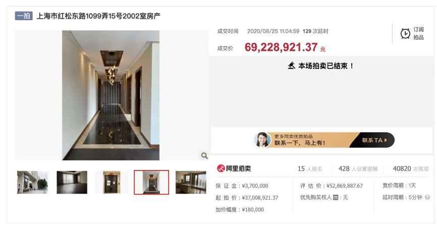 去年8月,司法平臺(tái)上一套標(biāo)的為“上海市紅松東路1099弄15號(hào)2002室”的房產(chǎn)被競拍者以69228921.37元(約7千萬)的價(jià)格拍下,比評(píng)估價(jià)5287萬高出了1636萬。