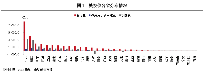 從募資用于項目建設的城投債發行情況來看,居前三位的省份為江蘇、浙江和四川,分別為703.1億元、526.7億元、454.36億元,而天津、山西、甘肅、內蒙古、西藏、遼寧、寧夏、黑龍江、青海等省份沒有相關債券發行。總之,江蘇、浙江和山東等東部地區省份由于財政實力較強、債務風險較低,無論發行規模還是凈融資規模均較大,而東北地區和內蒙古、青海、寧夏等西部地區由于財政實力較弱、債務風險較高,城投債發行較小。