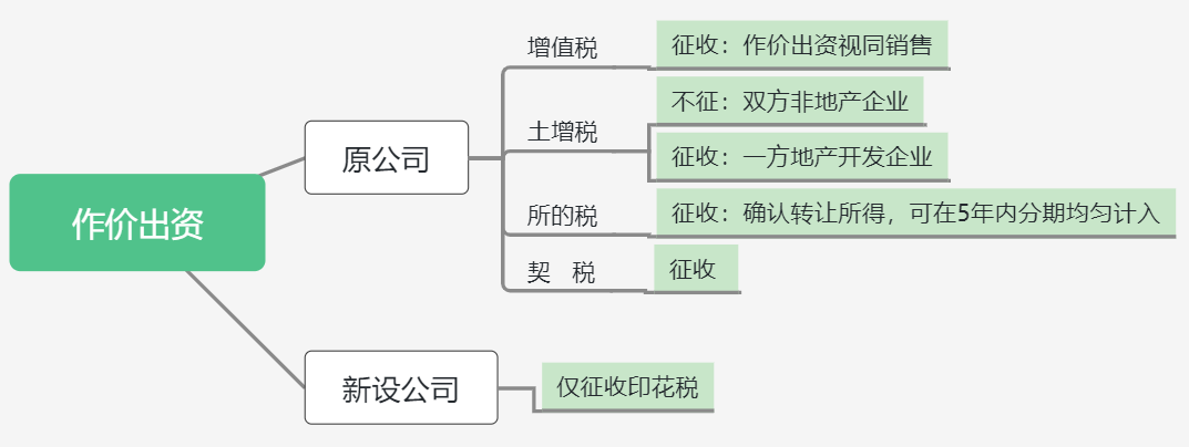 相較于資產(chǎn)轉(zhuǎn)讓,作價出資有兩點優(yōu)勢:一是,在部分要求較為寬容的城市作價出資不受25%的投資額限制;二是,作價出資在“所得稅、土增稅”上存在籌劃空間,尤其所得額可在5年內(nèi)分期計入,對于降低現(xiàn)金流峰值好處很大。