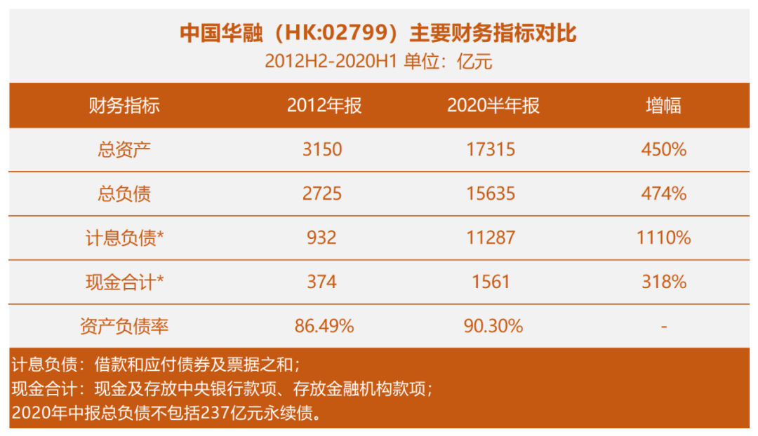 經(jīng)過二十多年的擴張,華融已經(jīng)發(fā)展成為集各類金融牌照于一身的金融平臺。2020年上半年,中國華融總資產(chǎn)1.73萬億,總負債1.56萬億,資產(chǎn)負債率90.3%。
