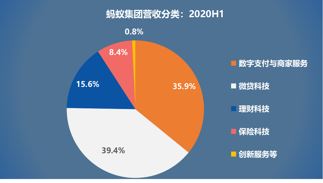 數(shù)字支付商戶服務收入和科技平臺業(yè)務(微貸+理財+保險)收入,在2020年半年報中,750億左右的營業(yè)收入中兩者的比例約為35:65。