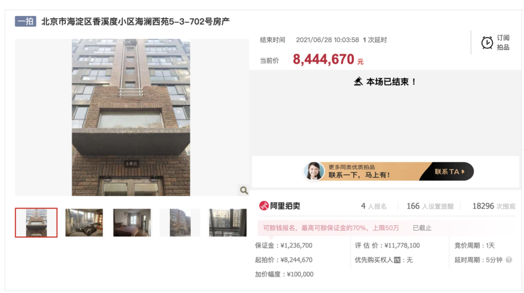 比如這兩天剛結(jié)束的一套北京市海淀區(qū)香溪度小區(qū)的房產(chǎn),涉案房產(chǎn)系沒收上繳國庫財(cái)產(chǎn)。起拍價(jià)為824萬元,市場價(jià)1320萬元,保證金為123.67萬元,4人報(bào)名,18029人圍觀,3次出價(jià),最終以高于起拍價(jià)20萬元,總價(jià)844萬元成交,低于市場價(jià)近500萬。