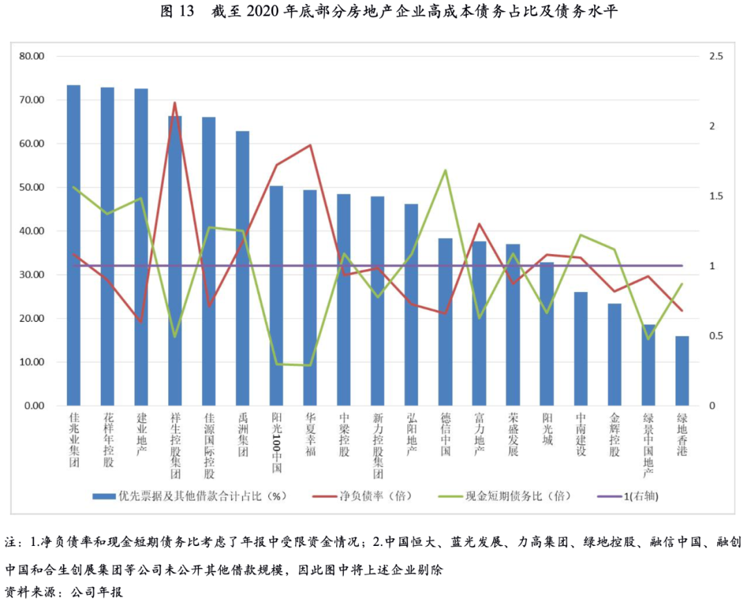 我們認(rèn)為,融資渠道中高成本的優(yōu)先票據(jù)及其他借款(以信托和資管計(jì)劃等非標(biāo)融資為主)合計(jì)占比較高,一定程度上能反映出公司境內(nèi)銀行和公開市場融資難度大。另一方面,美元債發(fā)行及交易影響因素多,二級(jí)市場價(jià)格波動(dòng)可能會(huì)引發(fā)公司提前贖回債券,從而影響公司正常的資金安排;此外,國家相關(guān)政策在收縮非標(biāo)融資規(guī)模,長遠(yuǎn)看房地產(chǎn)企業(yè)非標(biāo)融資難度也將越來越大。因此,優(yōu)先票據(jù)及其他借款占比高,可能預(yù)示著公司的潛在信用風(fēng)險(xiǎn)較大。