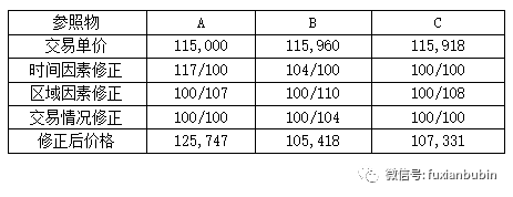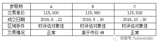 被評估對象與參照物結(jié)構(gòu)相似、新舊程度相近,故無需對功能因素和成新率因素調(diào)整。被評估對象所在區(qū)域的綜合評分為100,三個參照物所在區(qū)域條件均比被評估對象區(qū)域好,綜合評分分別為107、110和108。當時房產(chǎn)價格月上漲率為4%,故參照物A的時間因素調(diào)整系數(shù)為:117/100;參照物B的時間因素調(diào)整系數(shù):104/100;參照物C因在評估基準日當月交易,故無需調(diào)整。三個參照物成交價格的調(diào)整過程如下: