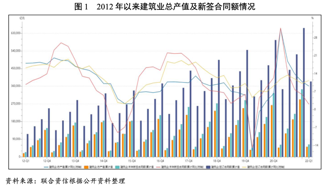 從行業層面來看,2021年及2022年一季度全國建筑業總體維持中低速增長,新簽合同額仍保持增長但受新冠疫情影響增速有所下降,行業集中度進一步提升。