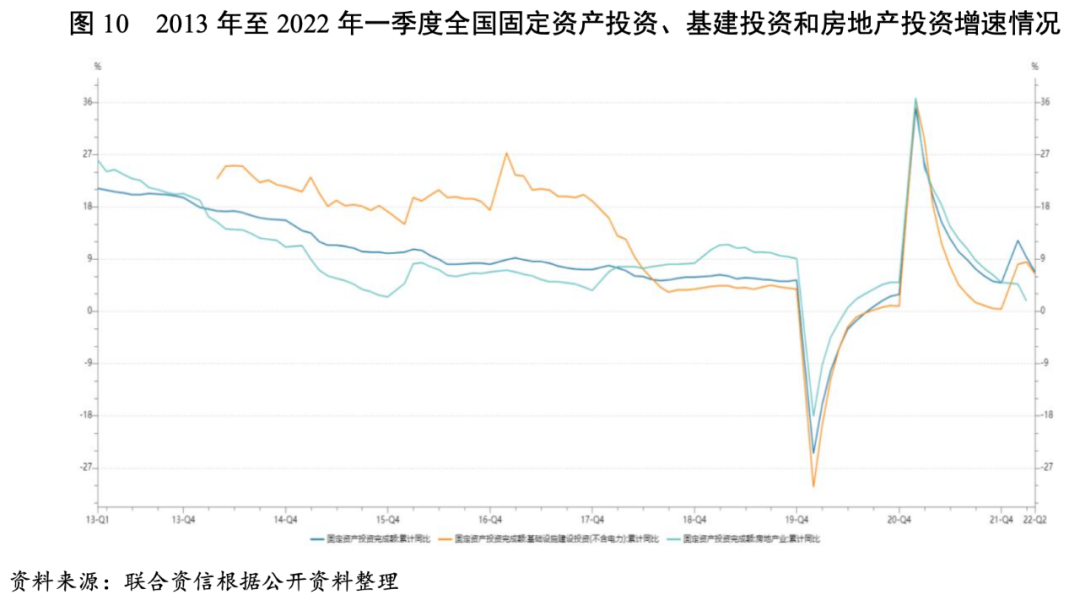 2021年及2022年一季度,全國固定資產投資保持增長。其中,2022年一季度房地產開發投資增速繼續下降,拿地和銷售數據繼續走弱對未來新開工面積形成較大抑制,房地產開發投資或將延續下行趨勢;基建投資增速回升明顯,作為“穩增長”的重要抓手,基建投資增速或將保持較高水平。
