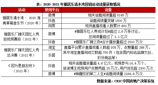 2020年初,雅居樂計(jì)劃舉辦第八屆國際沙灘啤酒狂歡節(jié),原希望以“國潮+英倫+啤酒”的形式讓業(yè)主感受不一樣的新年氛圍,后期由于疫情未能舉辦,但雅居樂的造勢(shì)積極性并未受到打擊。同年11月,超6萬名樂迷齊聚清水灣,雅居樂清水灣·2020海南草莓音樂節(jié)開啟全網(wǎng)超2億次的平臺(tái)傳播浪潮。2021年雅居樂乘勝追擊,通過雅居樂廠牌天團(tuán)紅人秀選出“清水灣隊(duì)”,進(jìn)入“樂居廠牌之夜終極大秀”,海南清水灣品牌獲得持續(xù)推廣。廠牌天團(tuán)紅人秀是“地產(chǎn)圈+娛樂圈+直播圈”的勇敢嘗試。2021年12月,雅居樂聯(lián)合英皇娛樂制作房產(chǎn)行業(yè)內(nèi)首個(gè)綜藝跨界的節(jié)目——《因?yàn)槭桥笥蜒健罚ㄟ^與眾多平臺(tái)深度內(nèi)容合作,持續(xù)推廣清水灣項(xiàng)目,同時(shí)開通抖音小店和“沉浸式”直播,推出明星同款海島游和購房折扣券,實(shí)現(xiàn)邊看邊買的線上線下聯(lián)動(dòng)的營銷閉環(huán)。