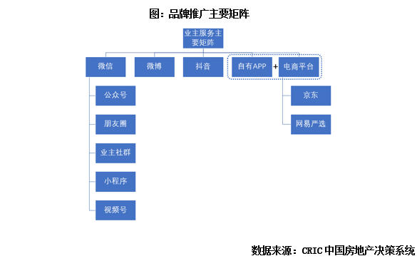 從目前地產(chǎn)企業(yè)的營銷行為來看,橫向矩陣用的比較多的新媒體平臺(tái)主要集中在社交軟件和短視頻直播平臺(tái)兩種。社交軟件方面,由于微信的私人和工作雙重社交屬性加上企業(yè)微信的普及,房企多開設(shè)微信公眾號(hào)、服務(wù)號(hào)等進(jìn)行內(nèi)容營銷,且通過小程序?qū)崿F(xiàn)線上看房。也有不少房企在微博上開設(shè)藍(lán)V賬號(hào),多渠道觸達(dá)、加強(qiáng)與業(yè)主的互動(dòng)等,增加曝光度打造品牌口碑。但由于目前微博流量較為分散,加上作為開放平臺(tái),客戶抱怨評(píng)論等負(fù)面效應(yīng)較多,不少房企微博更新頻次低或者已經(jīng)棄用。直播平臺(tái)方面,主要是抖音、快手等發(fā)布小視頻和直播營銷,淘寶直播進(jìn)行互動(dòng)及房產(chǎn)推介。此外由于微信前期的客戶積累,獲客成本減少,不少企業(yè)也開設(shè)微信視頻號(hào)進(jìn)行小視頻及直播互動(dòng)。此外,有部分房企根據(jù)自身情況,搭建品牌APP來進(jìn)行服務(wù)與宣傳。