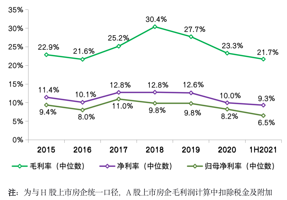 CRIC數(shù)據(jù)顯示,今年上半年80家典型上市房企毛利率中位數(shù)僅為21.7%,同比降低1.6個百分點。凈利率和歸母凈利率中位數(shù)分別降低0.6和1.7個百分點至9.3%和6.5%。三大核心指標均呈現(xiàn)下行趨勢,上半年降幅較2020年進一步擴大。