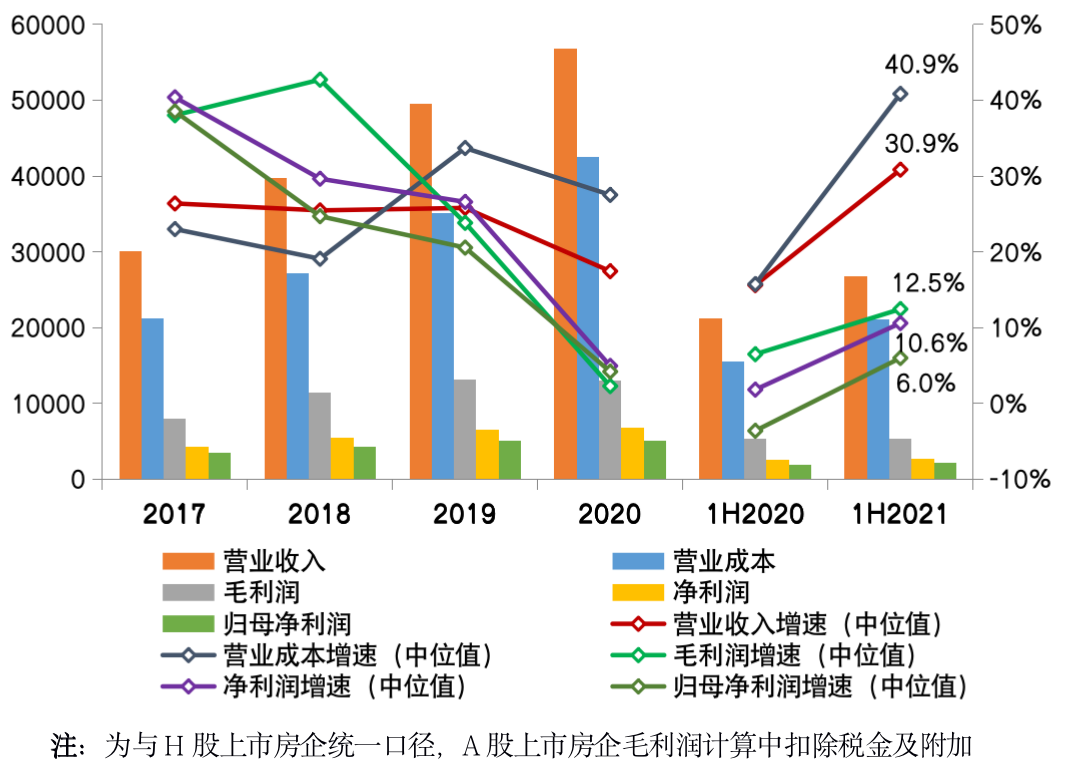 2021年上半年,CRIC監(jiān)測的80家典型上市房企整體實現(xiàn)營收收入26839億元、營業(yè)成本21039億元,營收和營業(yè)成本的增速中位值分別為30.9%和40.9%。