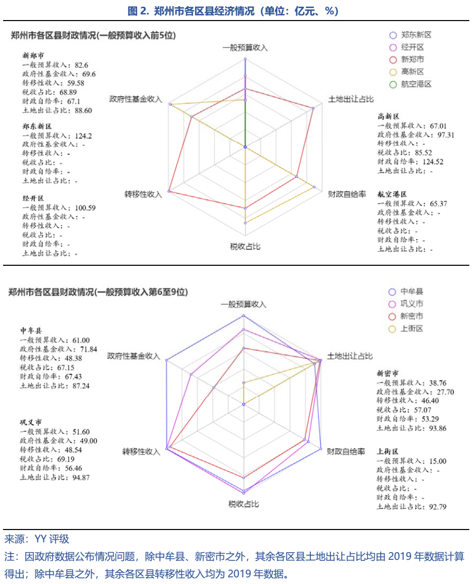 截至7月中旬,因鄭州市仍有多個(gè)區(qū)縣尚未披露最新的財(cái)政預(yù)決算報(bào)告,2020年的財(cái)政數(shù)據(jù)缺失較多,可見鄭州區(qū)域的數(shù)據(jù)披露的及時(shí)性和完整性都比較吊車尾。從已有數(shù)據(jù)來看,鄭州各區(qū)中,鄭東新區(qū)和經(jīng)開區(qū)的財(cái)政實(shí)力最強(qiáng),為鄭州市2020年一般預(yù)算收入超100億元的唯二區(qū)域,但缺乏更多維度的財(cái)政數(shù)據(jù)。此外,一般預(yù)算收入排名第五的航空港區(qū)同樣缺乏更多的財(cái)政數(shù)據(jù)。