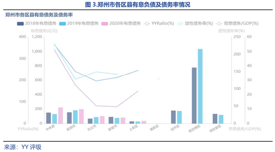 鄭州市總體債務(wù)率不高,分區(qū)域看,因發(fā)展需要,航空港區(qū)2018、2019年有息債務(wù)“一騎絕塵”,但2020年數(shù)據(jù)尚未披露完整。從目前可得的2020年的債務(wù)數(shù)據(jù)來看,中牟縣的帶息債務(wù)絕對值和債務(wù)率均最高,截至2020年末,中牟縣有息債務(wù)余額為222.32億元,YY-Ratio為364.46%,債務(wù)風(fēng)險(xiǎn)并不高;新鄭市的有息債務(wù)余額和債務(wù)率次之;值得注意的是,上街區(qū)的有息債務(wù)余額雖然不高,但因財(cái)政實(shí)力較弱,YY-Ratio較高。