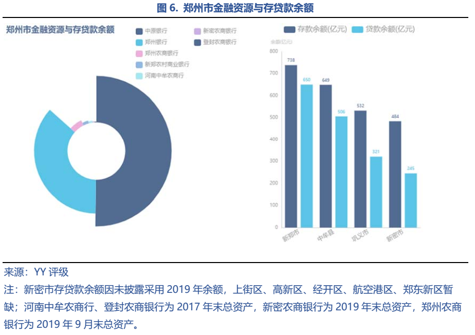 鄭州銀行數(shù)量尚可,但主要是農(nóng)商行,信息披露程度不高。鄭州市共有9家銀行,其中2家城商行(中原銀行和鄭州銀行),7家農(nóng)商行(鄭州農(nóng)商銀行、中牟農(nóng)商銀行、新密農(nóng)商銀行、鞏義農(nóng)商銀行、新鄭農(nóng)村商業(yè)銀行、滎陽農(nóng)商銀行和登封農(nóng)商銀行)。從數(shù)量上看,鄭州市銀行并不少,但以農(nóng)商行為主,財(cái)務(wù)信息披露不多,除中原銀行、鄭州銀行、新鄭農(nóng)村商業(yè)銀行之外,其余銀行的總資產(chǎn)等數(shù)據(jù)僅可追溯至2017、甚至2011年。2020年末中原銀行和鄭州銀行的資產(chǎn)規(guī)模分別為7,574.82和5,478.13億元,在“中國銀行業(yè)100強(qiáng)榜單”中分別位居第35和42名,金融資源實(shí)力較強(qiáng)。