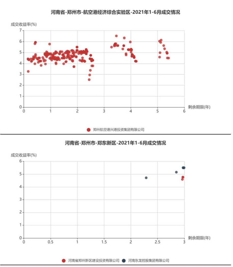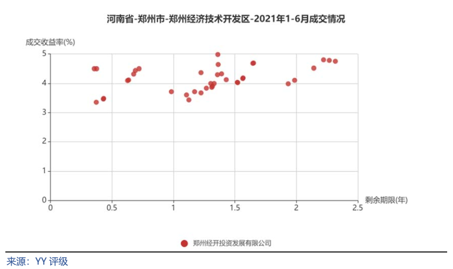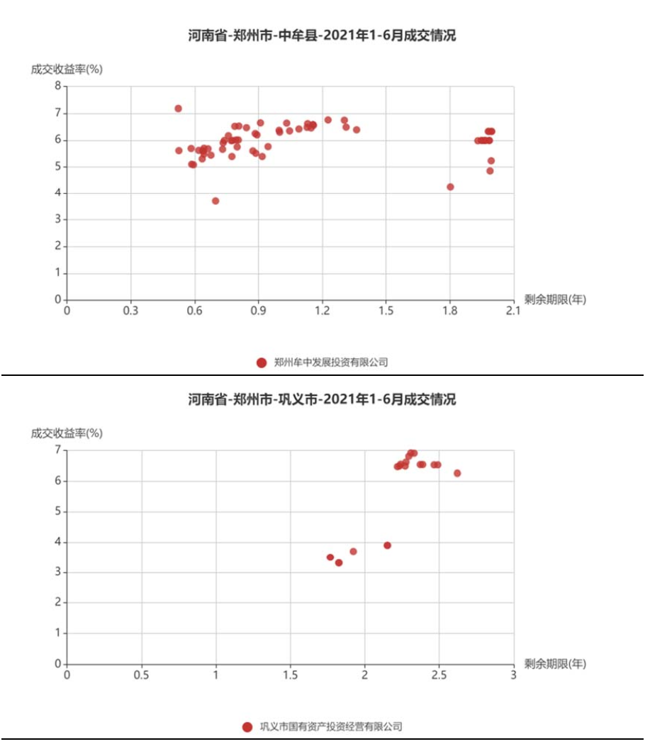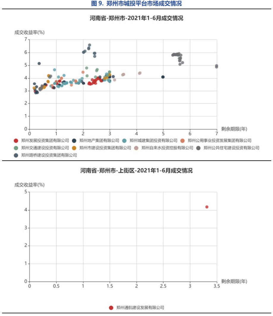將鄭州市城投平臺按照行政層級和所屬區(qū)域,分為9類分別展示成交情況。具體來看,鄭州市級平臺成交活躍,成交收益率分散在3%~6%,基本隨著剩余期限遞增;中牟縣成交收益率相對較高,在5%~7%;鞏義市分散在3%~4%和6%~7%兩個(gè)區(qū)間;新鄭市、航空港區(qū)、鄭東新區(qū)均集中在4%~6%;經(jīng)開區(qū)集中在4%附近;新密市成交收益率相對分散;上街區(qū)僅一個(gè)成交主體。