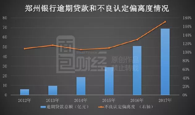 同期鄭州銀行不良貸款偏離度也在明顯抬升,截至2017年底鄭州銀行不良偏離度已經(jīng)超過170%。