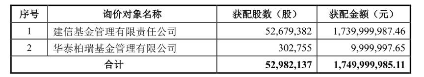 隨后,萬(wàn)豐奧威在2015年12月30日非公開發(fā)行股票發(fā)行情況公告中稱,公司共發(fā)行約5298萬(wàn)股,發(fā)行價(jià)格為33.03元/股,共募集基金總額約17.5億元。此次非公開發(fā)行新增股份將于2015年12 月 31日在深圳證券交易所上市,且投資者認(rèn)購(gòu)的本次非公開發(fā)行股票自上市之日起 12 個(gè)月內(nèi)不得轉(zhuǎn)讓。而本次非公開發(fā)行的對(duì)象僅有2名,最終確定的發(fā)行對(duì)象及獲配情況如下: