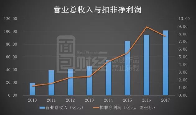 先交代一下萬(wàn)豐奧威2017年的業(yè)績(jī)。公司的營(yíng)業(yè)總收入突破了100億,同比增長(zhǎng)7.29%,但歸母凈利潤(rùn)與扣非凈利潤(rùn)都出現(xiàn)了不同程度的下滑,較去年同期相比下滑分別為5.99%和13.6%,出現(xiàn)了增收不增利的情況。