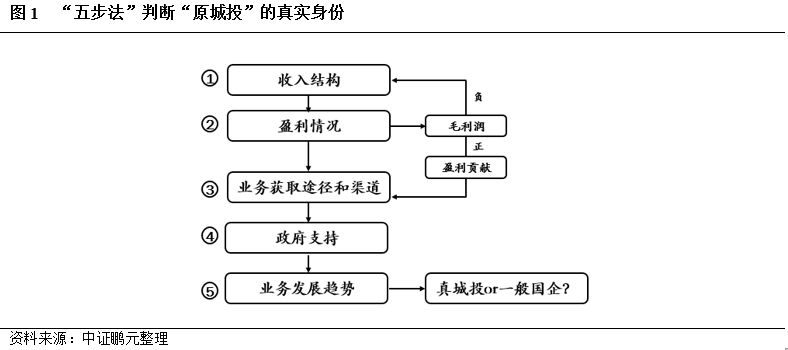 那么,究竟該如何對(duì)第三類“原城投”進(jìn)行信用分析呢?本文建議,首先應(yīng)按照“五步法”(見(jiàn)圖1)對(duì)其身份進(jìn)行判斷