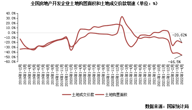 據(jù)國(guó)家統(tǒng)計(jì)局?jǐn)?shù)據(jù):1-4月,房地產(chǎn)開發(fā)企業(yè)土地購(gòu)置面積1766萬(wàn)平方米,同比下降46.5%;土地成交價(jià)款955億元,下降20.6%;二者降幅均較1-3月有所擴(kuò)大。單月來(lái)看,4月土地購(gòu)置面積和土地成交價(jià)款分別為427萬(wàn)平方米和283億元,同比下降57%和28%。