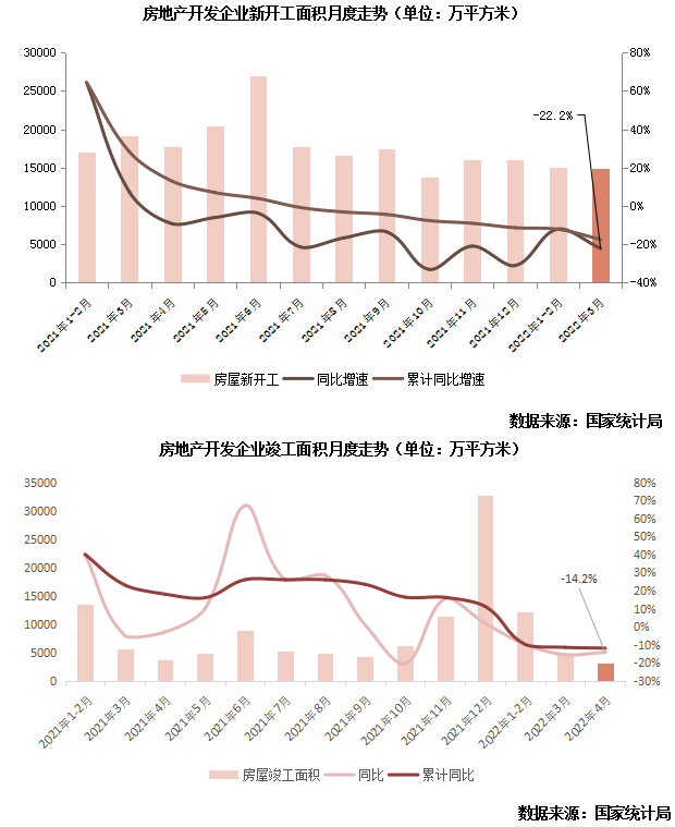 從數(shù)據(jù)上看,前4月施工面積增速已降至0%,創(chuàng)近五年新低。4月新開工面積不足1億平方米,規(guī)模為2014年以來(lái)月度歷史新低,同比降幅較3月擴(kuò)大21.9pcts;竣工面積環(huán)比再降34.4%,同樣創(chuàng)月度歷史新低。