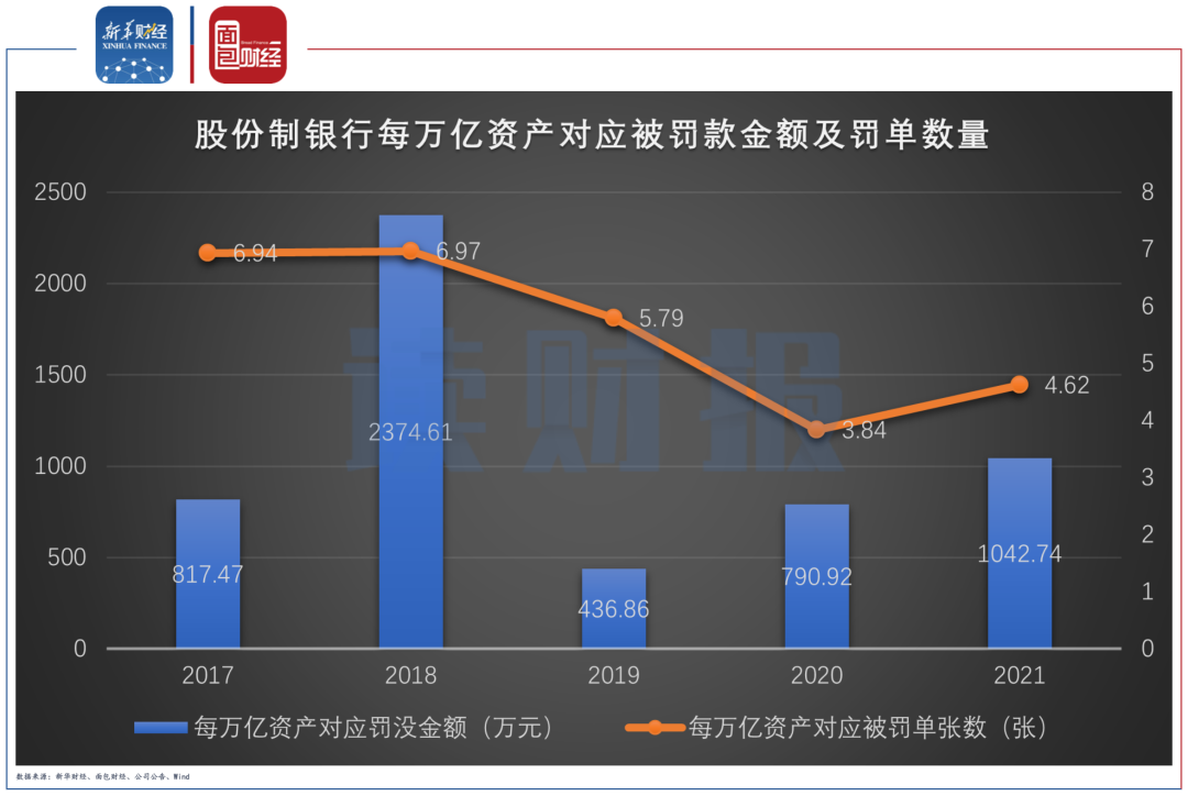 圖2:2017-2021年股份制銀行每萬(wàn)億資產(chǎn)對(duì)應(yīng)被罰款金額及收罰單數(shù)量
