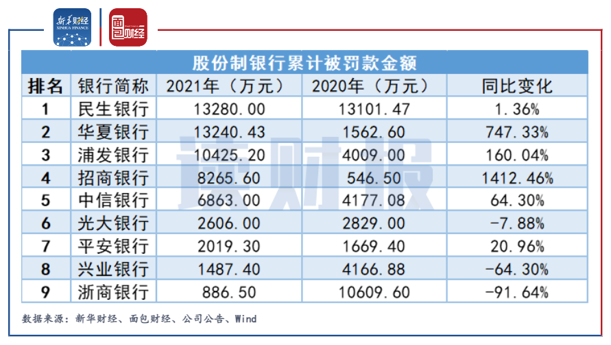 從被罰金額來(lái)看,2021年民生銀行、華夏銀行及浦發(fā)銀行的累計(jì)被罰金額均過(guò)億元。