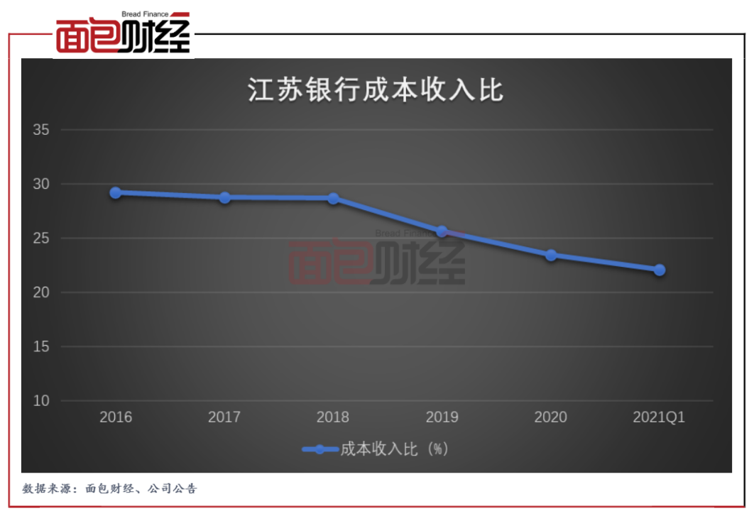 凈利潤的增幅擴大與江蘇銀行成本收入比持續降低有關。數據顯示,截至2021年一季度,該行的收入成本比為22.12%,較上年末減少1.34個百分點。