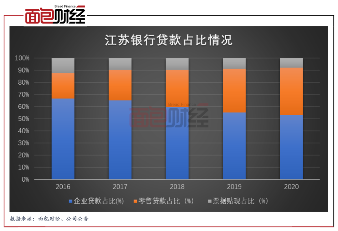 資產負債規模增長的同時,江蘇銀行的資產結構也在不斷優化。截至2020年末,貸款在總資產中的占比超過51%,較上年增加1.01個百分點,占比連續五年提升。