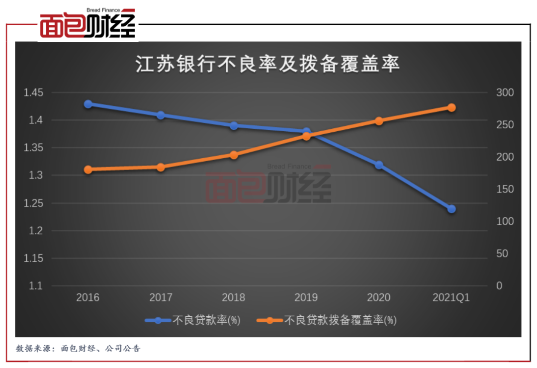 在營收、凈利保持兩位數增長的同時,江蘇銀行的資產質量持續提升,不良貸款率連續5年下降,撥備覆蓋率持續5年提升。