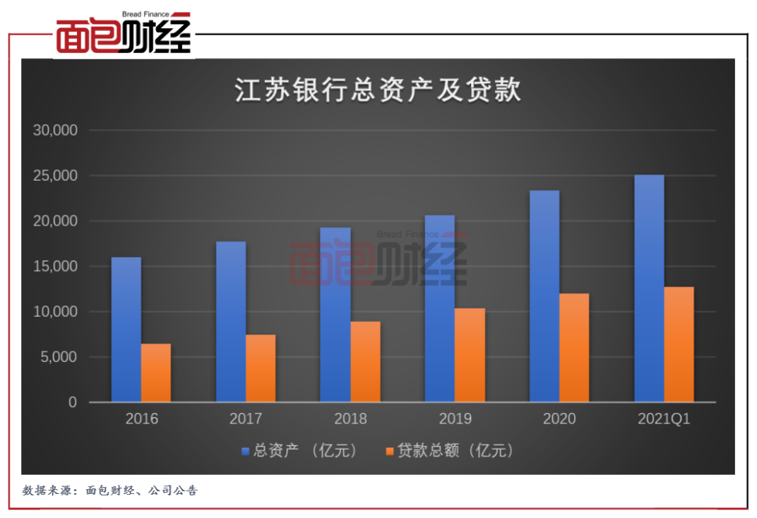 一季報顯示,該行的資產規模進一步擴大。截至2021年3月31日,江蘇銀行的總資產已達25047.81億元,較上年末增長7.14%。
