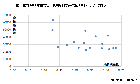 反之北京城建競(jìng)得的豐臺(tái)區(qū)[2022]003號(hào)地塊,成交樓板價(jià)為22008元/平方米,銷售指導(dǎo)價(jià)達(dá)到88000元/平方米,地價(jià)房?jī)r(jià)比僅有0.26,房?jī)r(jià)與地價(jià)的差值更是在6萬(wàn)元/平方米以上。但地塊存在5.4萬(wàn)平方米的產(chǎn)業(yè)用地,且有9800平方米的保障房,運(yùn)營(yíng)的復(fù)雜系數(shù)較高,因此最終仍是底價(jià)成交。