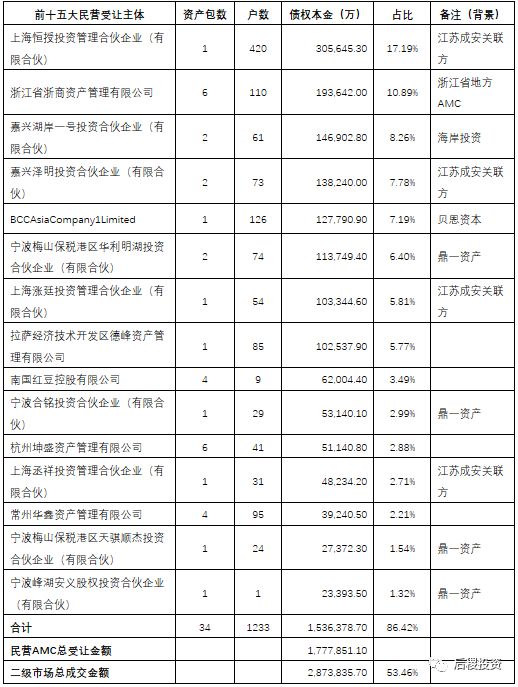江蘇二級市場,概括起來,其實就是個大機構投資市場,前十五大民營投資機構,合計受讓153.6億,占民營AMC受讓比重達86%以上,與二級市場總成交的287億相比,占比也達到了53.46%。