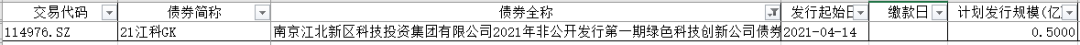 2、通過私募公司債券發行的碳中和債共1只,債券發行規模為0.50億元,發行人為南京江北新區科技投資集團有限公司。