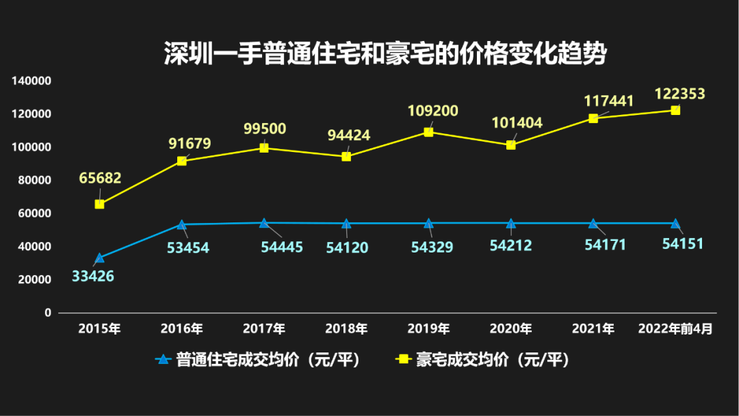 看深圳市場,豪宅的成交價在不斷攀升,今年前四個月的平均房價已經到了12萬多一平,近八年的時間漲了1.86倍。