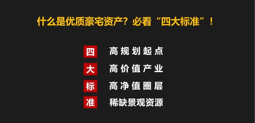 王老師提出,優質豪宅資產一定要看準四大稀缺標準:高規劃起點、高價值產業、高凈值圈層、稀缺景觀資源。