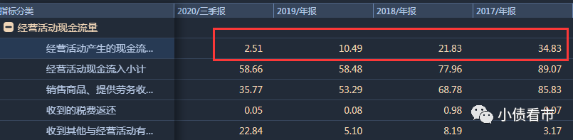 值得注意的是,在業(yè)績下滑的同時,鵬博士的經(jīng)營獲現(xiàn)能力也在不斷惡化。其經(jīng)營性現(xiàn)金流凈額從2015年的46.58億一直下滑至2019年的10.49億元,2020年前三季度僅錄得2.51億元。