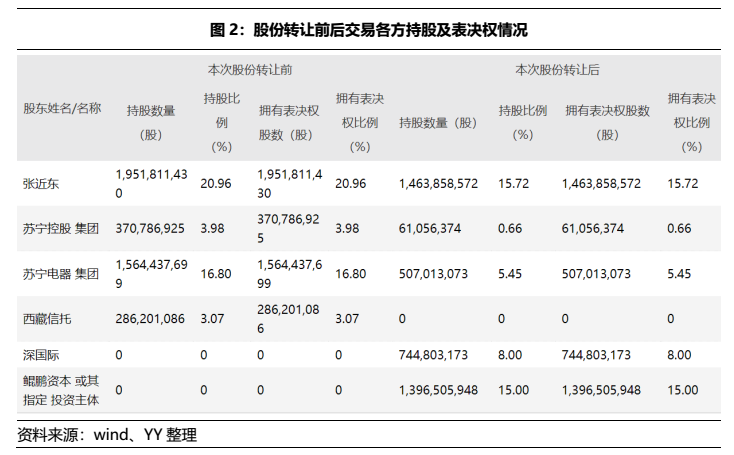 本次交易完成后,上市公司原控股股東、實(shí)控人張近東及其一致行動人蘇寧控股集團(tuán)持股比例將降至16.38%,蘇寧電器集團(tuán)持股比例降至5.45%,鯤鵬資本持股比例為15%,深國際持股比例為8%,張近東仍為蘇寧易購的第一大表決權(quán)股東。