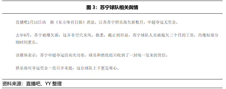同天,蘇寧球隊發(fā)布了停運(yùn)的公告,追溯1月的輿情可以發(fā)現(xiàn),之前蘇寧球隊就爆出欠薪三個月的消息,也印證了之前整個蘇寧系流動性的緊缺,另外此番剝離球隊,也有回歸主業(yè),剝離無關(guān)副業(yè)的決心。