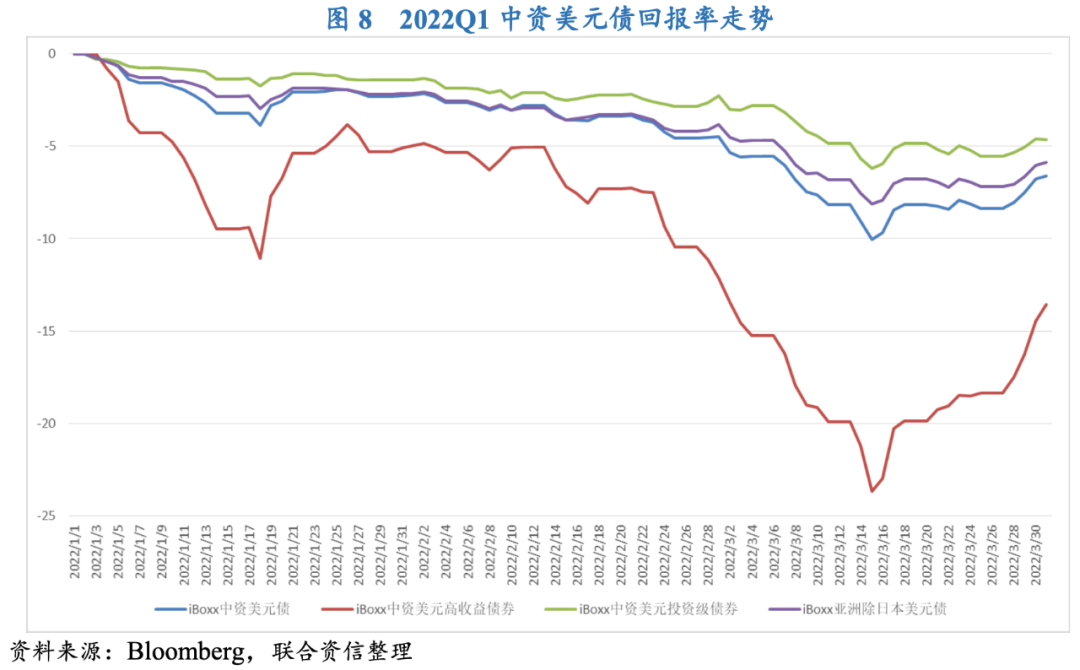 受美聯(lián)儲(chǔ)貨幣政策收緊以及俄烏地緣政治沖突爆發(fā)的影響,市場(chǎng)避險(xiǎn)情緒走高,疊加由地產(chǎn)板塊引發(fā)的信用風(fēng)險(xiǎn)事件仍在繼續(xù)發(fā)酵,共同導(dǎo)致中資美元債二級(jí)市場(chǎng)回報(bào)率繼續(xù)下跌