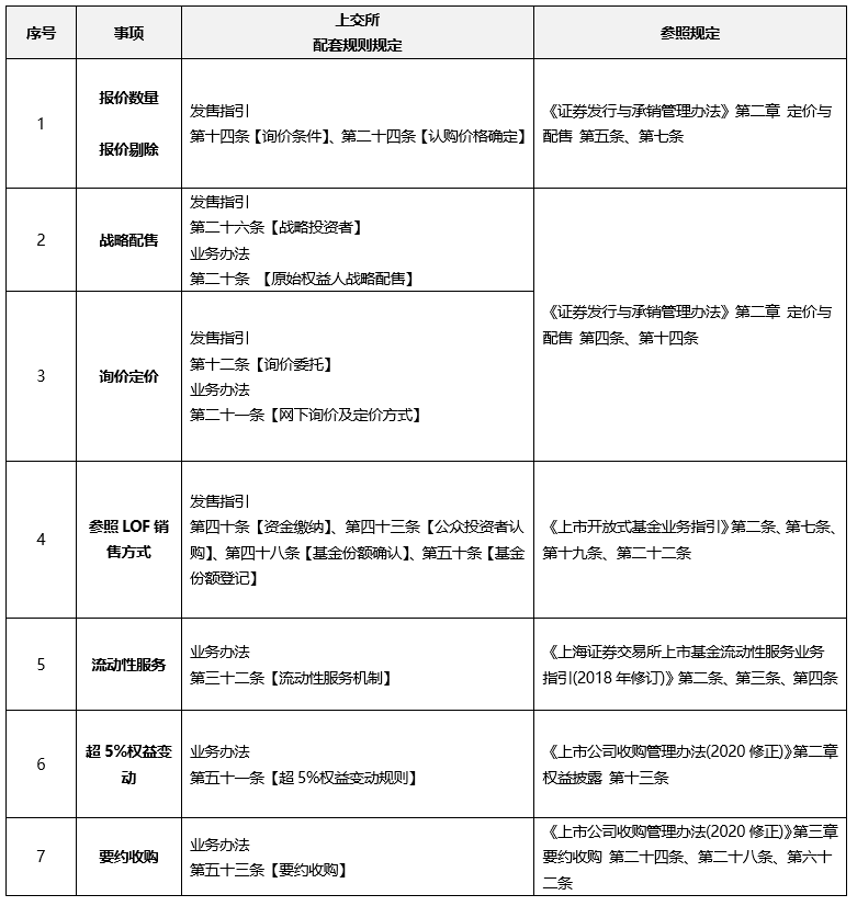 從思路來看, 配套規(guī)則總體采取了“比照股性規(guī)則, 搭建獨立體系”的總體立法思路。在業(yè)務(wù)辦法中, 比照了公開發(fā)行證券要求建立掛牌和上市審查制度, 但在全流程重要節(jié)點和關(guān)鍵環(huán)節(jié)規(guī)范與權(quán)責分配的角度, 保留了REITs產(chǎn)品的特殊性特色。在發(fā)售指引中, 借鑒了股票定價和LOF基金發(fā)售, 對公募REITs的詢價和定價進行了規(guī)范, 但同時在投資者報價個數(shù)要求、報價剔除、戰(zhàn)略配售機制等方面充分結(jié)合產(chǎn)品屬性特征, 作出了區(qū)別股票的特有安排。