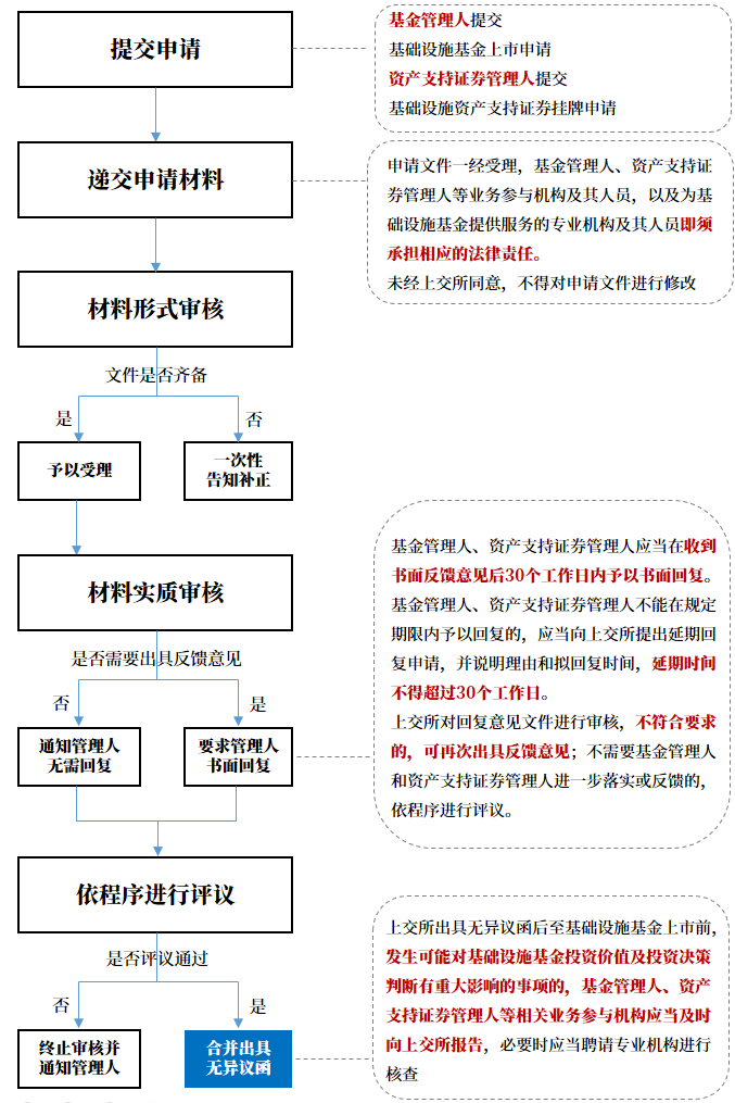上交所主要在業(yè)務(wù)辦法第二章“申請條件與確認程序”對公募REITs的基本審核程序及相關(guān)材料要求進行了明確, 該部分主要體現(xiàn)出兩個特點: