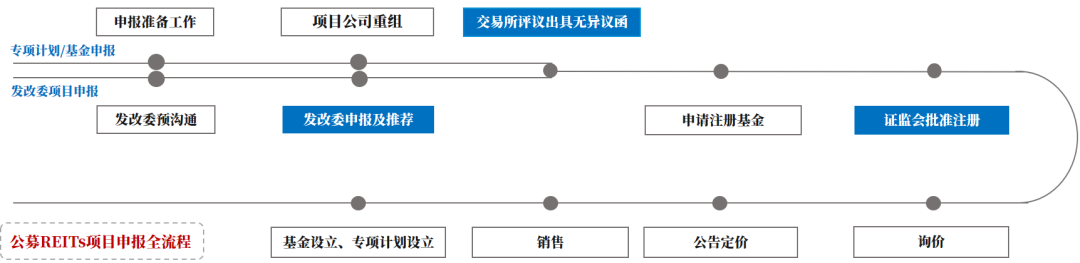 其一, 公募RETIs作為公募基金和資產(chǎn)支持證券相結(jié)合的產(chǎn)品, 上交所借鑒了此前對資產(chǎn)支持證券的管理經(jīng)驗, 結(jié)合公開證券發(fā)行的要求, 細化了對基礎(chǔ)設(shè)施資產(chǎn)支持證券的掛牌及基金上市的申請條件、協(xié)同盡調(diào)、申請文件等方面的要求, 同時明確了材料受理、審核與反饋所需時間。我們對公募REITs的申報全流程及上交所基本審核程序的梳理如下圖所示:
