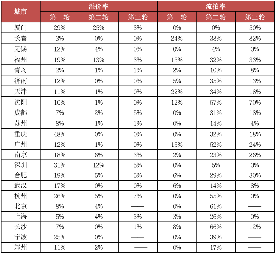 就重點城市集中土拍情況來看,超半數城市三輪集中供地成交量遞減,地價整體降幅達5%;熱度來看,首輪土拍熱度最高,二、三批次集中土拍市場熱度明顯下降,溢價率大幅下滑、流拍率持續攀升。