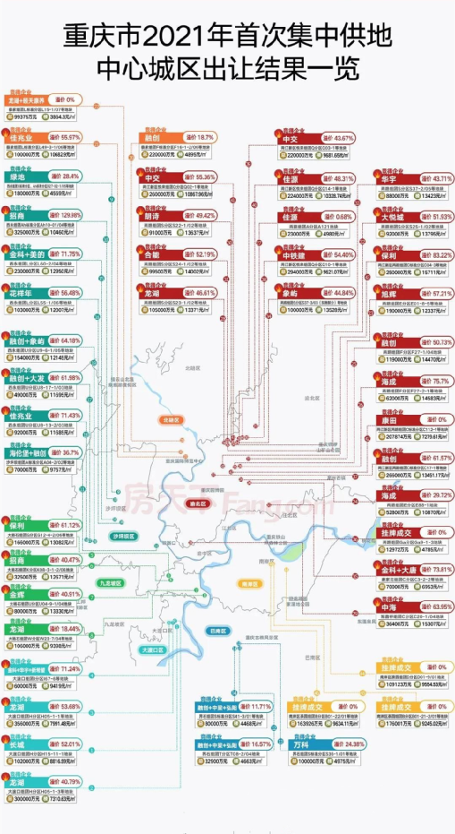 典型如重慶,首次土拍總體溢價率在50%左右,最高的溢價率則達到129.98%,不僅未能穩定預期,反倒是點燃了重慶人對樓市的熱情。